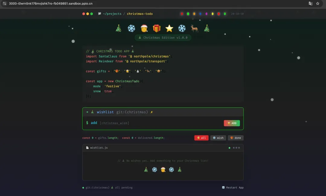 生成结果:圣诞版 Todo 应用,雪花飘落特效