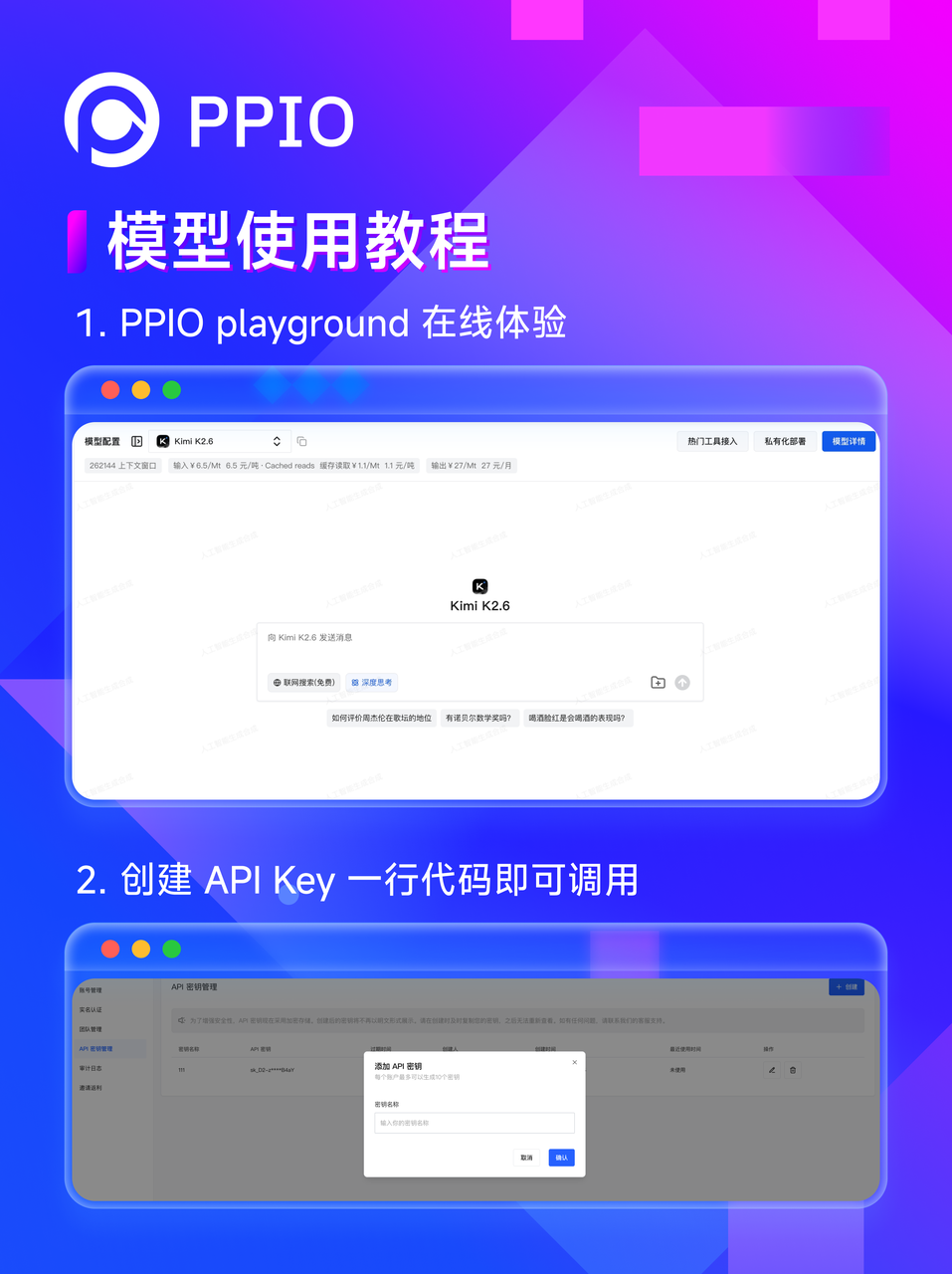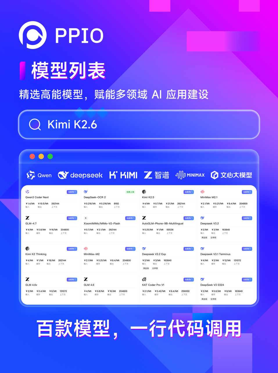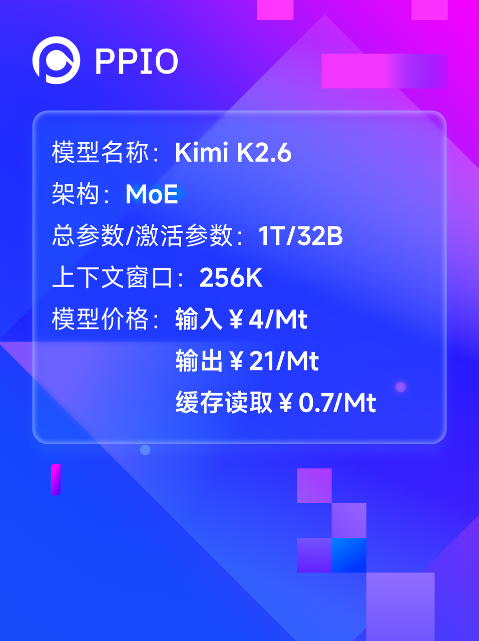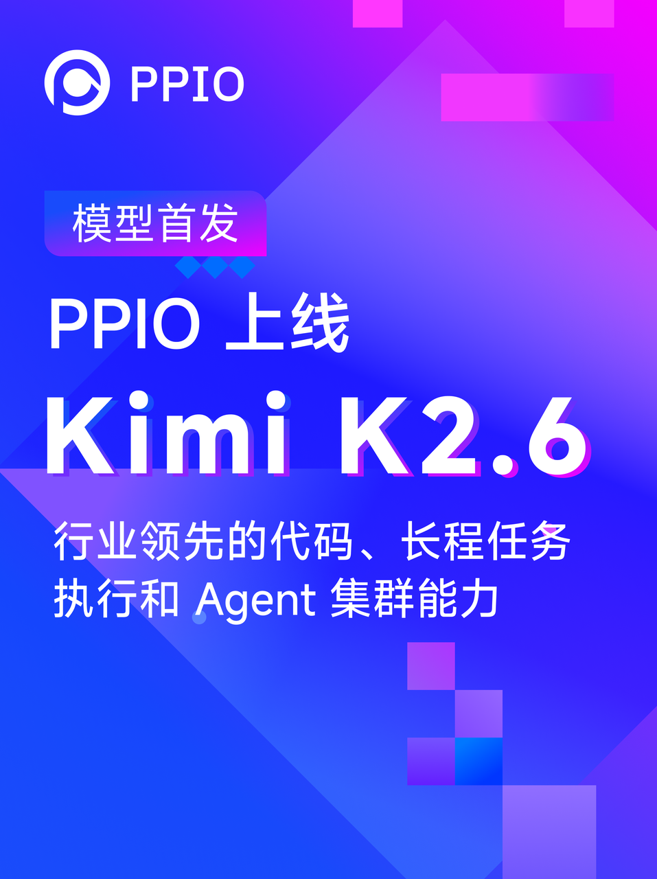 PPIO 作为 Kimi K2.6 的首发合作 AI 云平台,在推理基础设施上持续投入,致力于实现低延迟、高并发、稳定可靠的模型服务。现在起,通过 PPIO 即可调用 Kimi K2.6,价格与官方同步,性能与官方对齐。